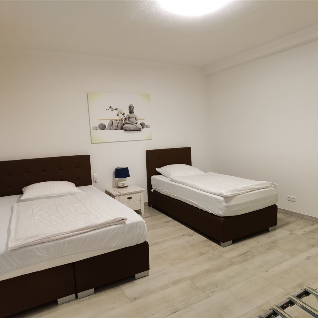 Unsere Ferienwohnung Nr. 2 verfügt über 3 Schlafzimmer mit Einzelbetten, einem großen Wohn- Essraum mit je einem Flat TV. Die Mindest - Mietdauer beträgt 2 Tage, der Preis für die Endreinigung 50,00 €, Der Mietpreis pro Tag beträgt 150,00 €