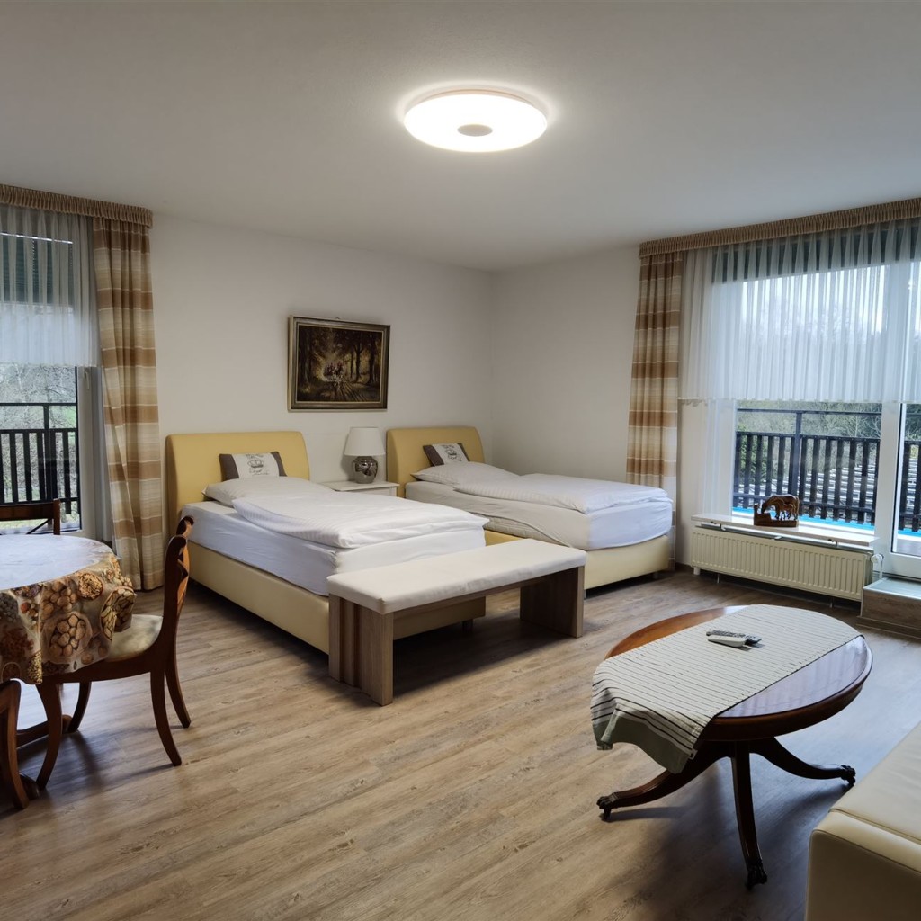 Wir bieten Ihnen: Schöne, geräumige Zimmer - teils mit Miniküche in den Appartements, komfortable und bequeme Betten, ruhig gelegen, eine parkähnliche und gepflegte Außenanlage an der Aue mit Grillmöglichkeit bei unserer "rustikalen Gatenhütte", Flat-TV und kostenloses W-LAN gehören zu unserem Angebot.